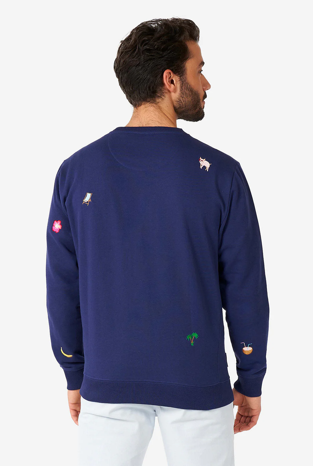 All things summer even when it's way to cold out for the beach and some coconut drinks. This quality sweater has tasteful embroidery showing the many aspects of the joy of warmth, play, and summer!