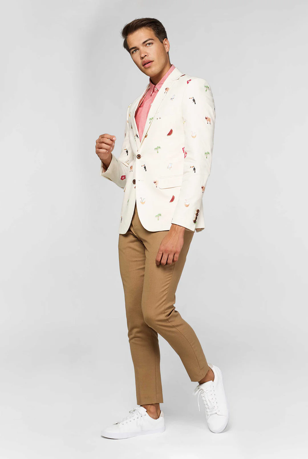 This off-white OppoSuits Deluxe blazer is designed to make you feel comfortable from the beach to the bar, from the office to a wedding and all places in between. Made of a lightweight cotton-linen mix, finished with all-over tropical embroideries, this blazer lends a breezy and subtle humorous touch to your formal look.